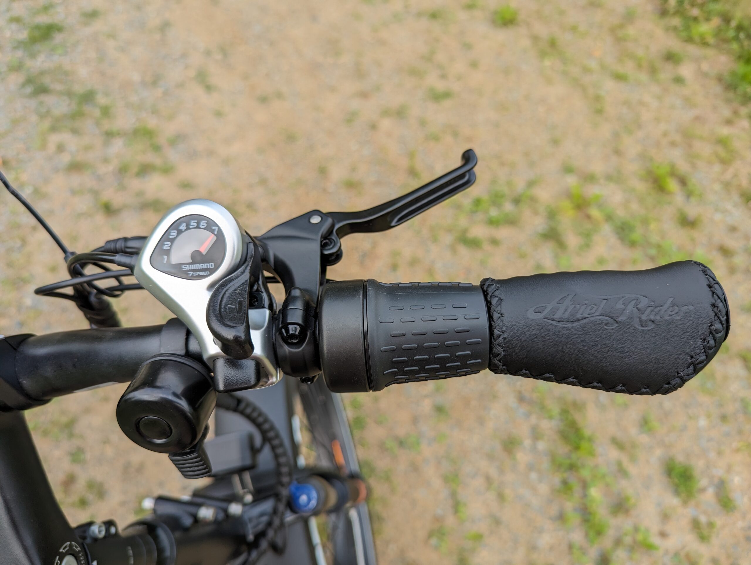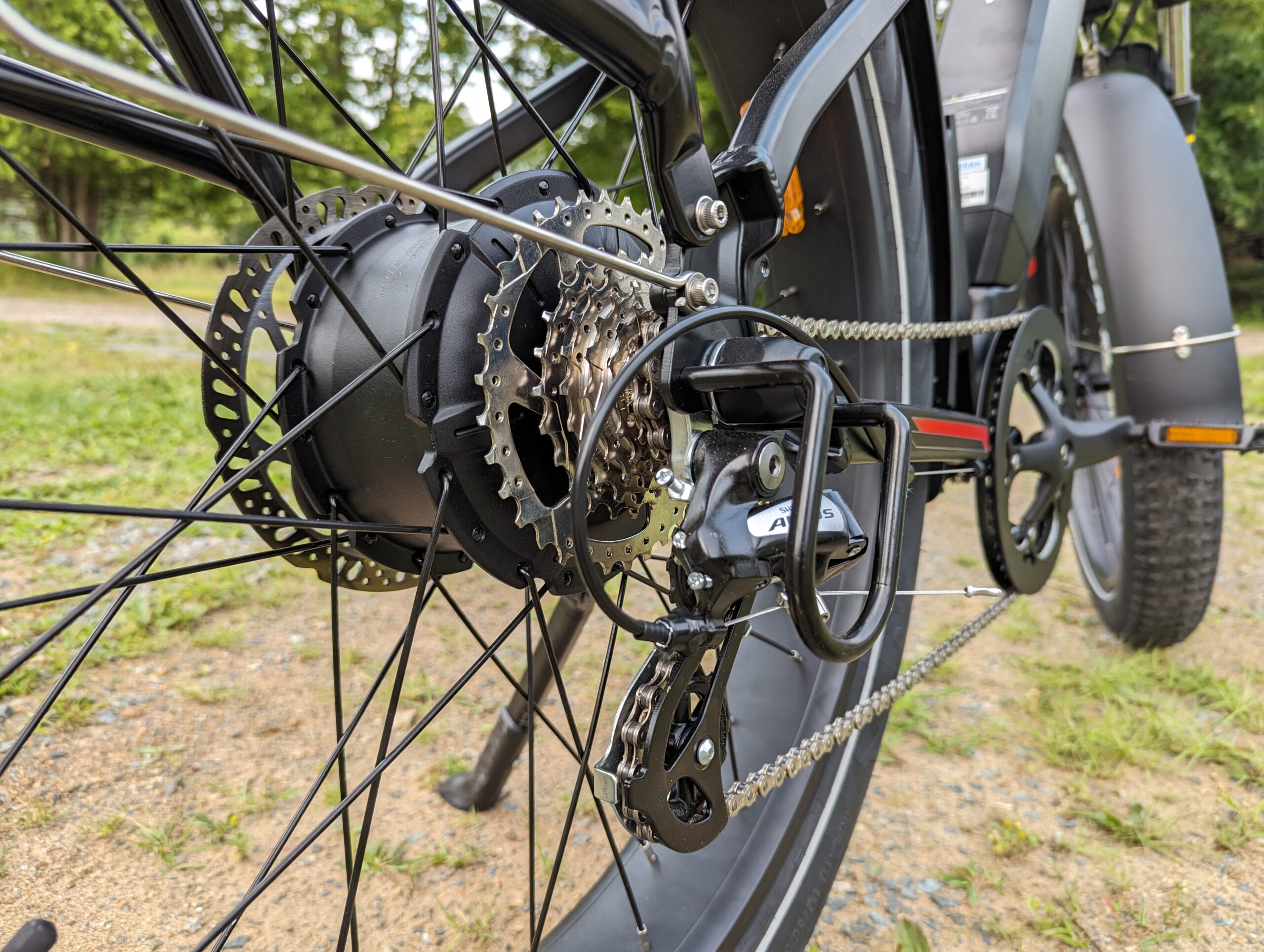 In the rear is a 7-Speed Shimano Altus deraileuer which is relatively basic, but popular choice among ebike brands in the $1000-$2000 price range. At the handlebars is a simple Shimano thumb shifter.