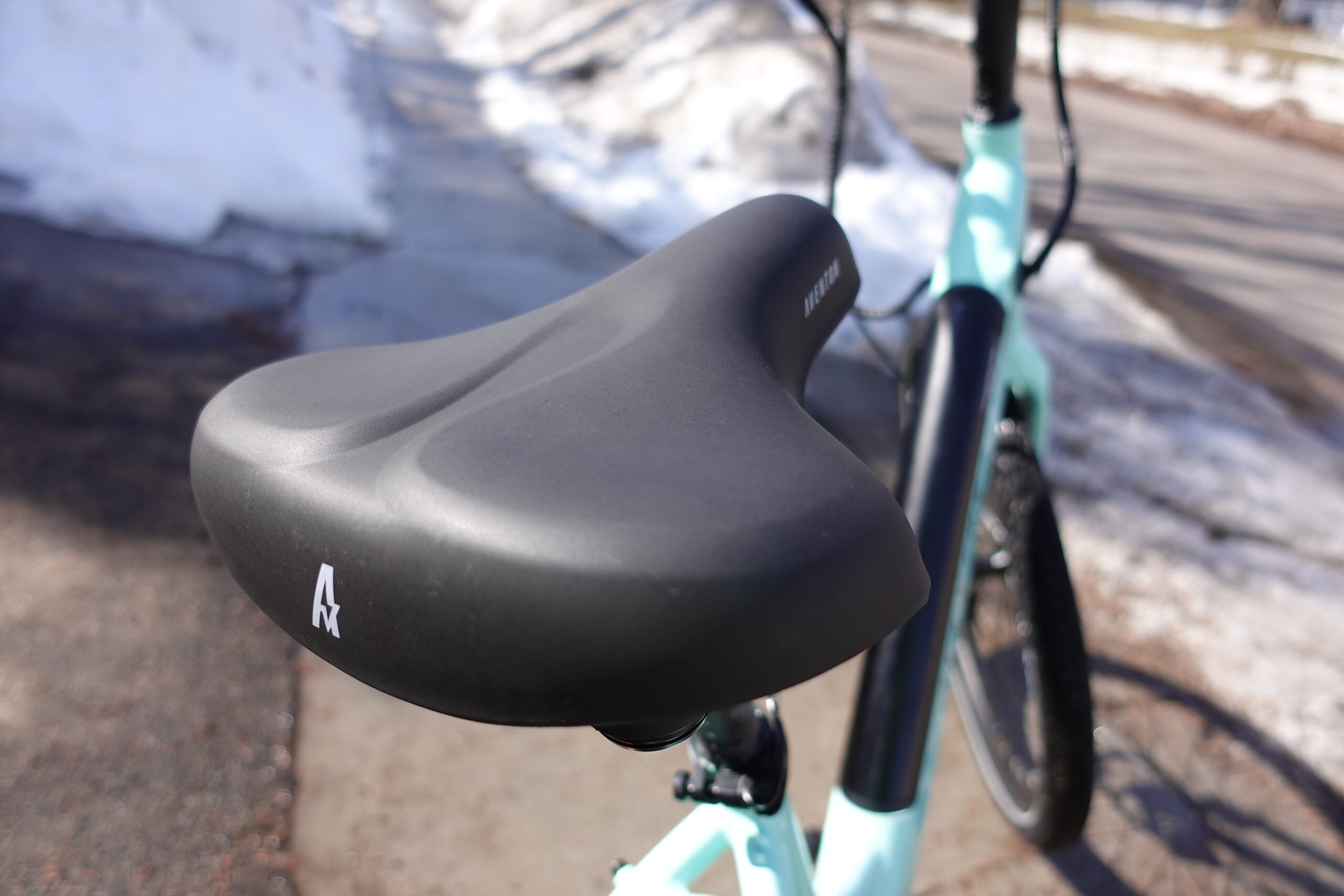The Pace 500 has a rigid front fork which will suffice on paved roads and trails. If you want front suspension we recommend checking out the Aventon Level or Aventon Level Step-Through or our suspension seatpost recommendation below. We do like that Aventon included swept back handlebars which put the rider in a more upright riding position. To further enhance rider comfort, an adjustable stem is included which allows the handlebars to move up and down. Finally, the Pace 500 includes locking grips and a surprisingly comfortable saddle.