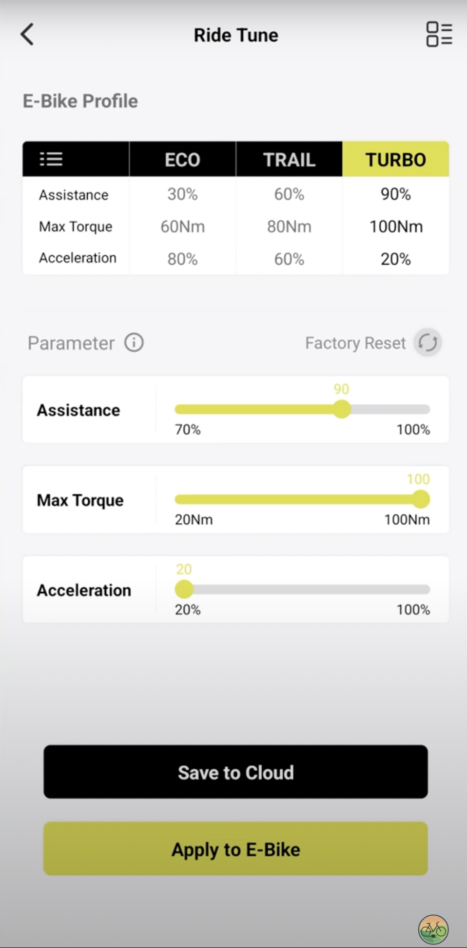 - Acceleration (Acceleration determines the bike’s initial power from a stop. Higher settings mean quicker response, while lower settings offer a more natural feel.)