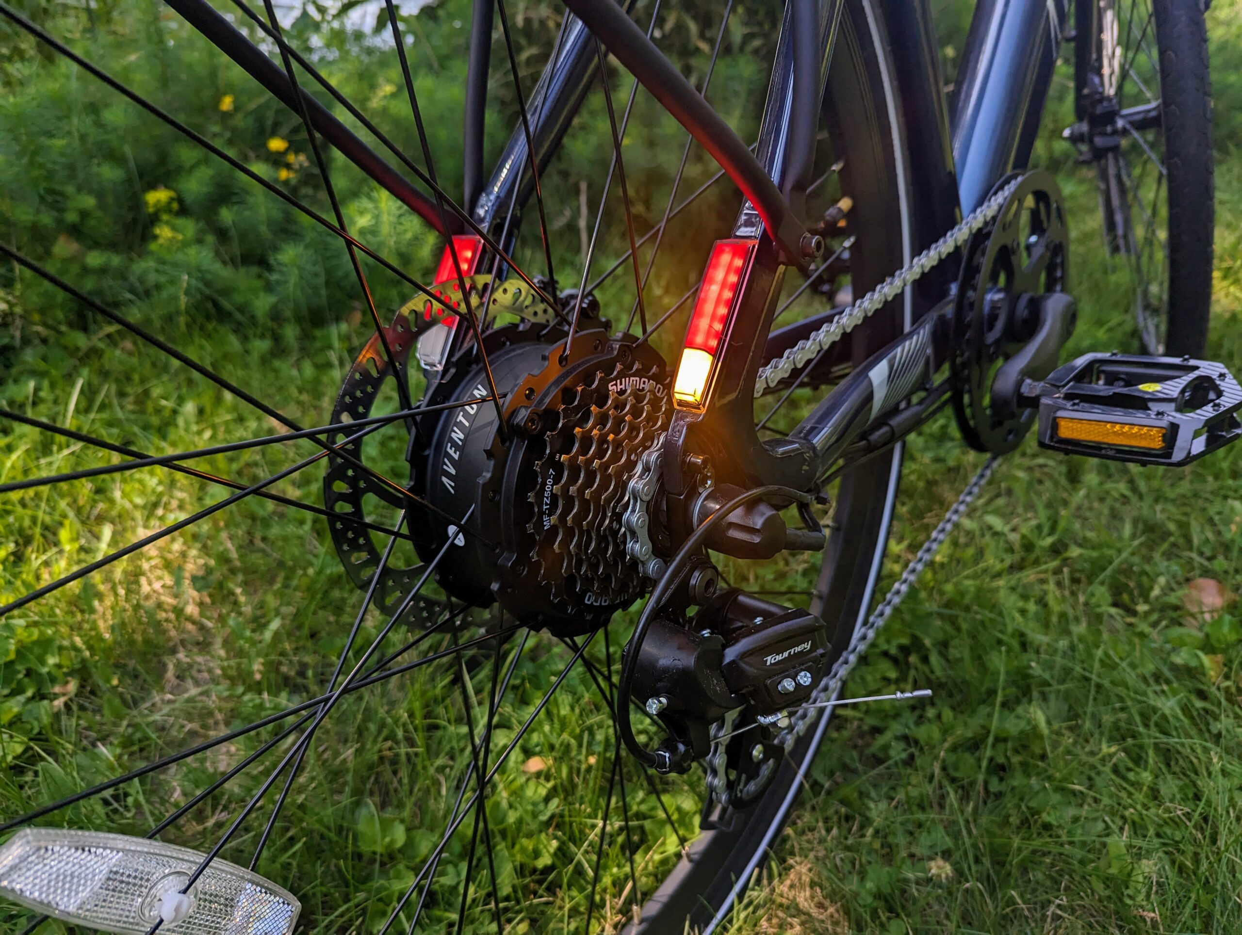 There’s a bolt-on front axle, meaning a wrench is needed to fix flats. Road bike tires are sized at 700x38c with reflective sidewalls. The 300 lumens integrated front light is brighter than average and Aventon’s utilization of the rear lights for brake lights and turn signals is a great safety feature.