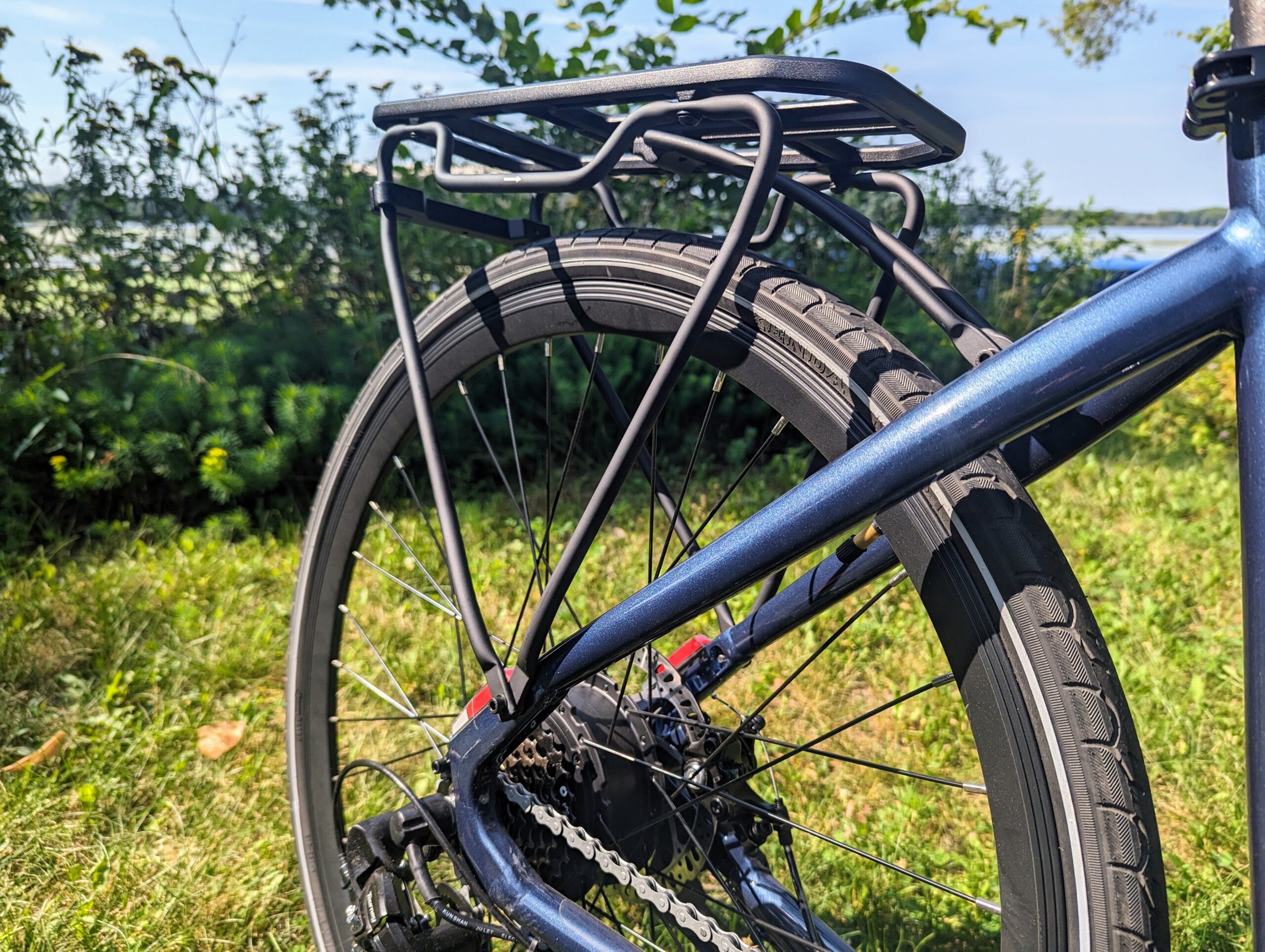 The 350W rear motor with 14 to 28-tooth rear and 48T front chainrings are pretty standard but very capable in this model. As is the entry-level Shimano Tourney derailleur, common even in bikes above the $2k price point. The Shimano Revoshift twist shifter is on the right handlebar, with a neat viewport to keep track of which of the seven gears is engaged.
