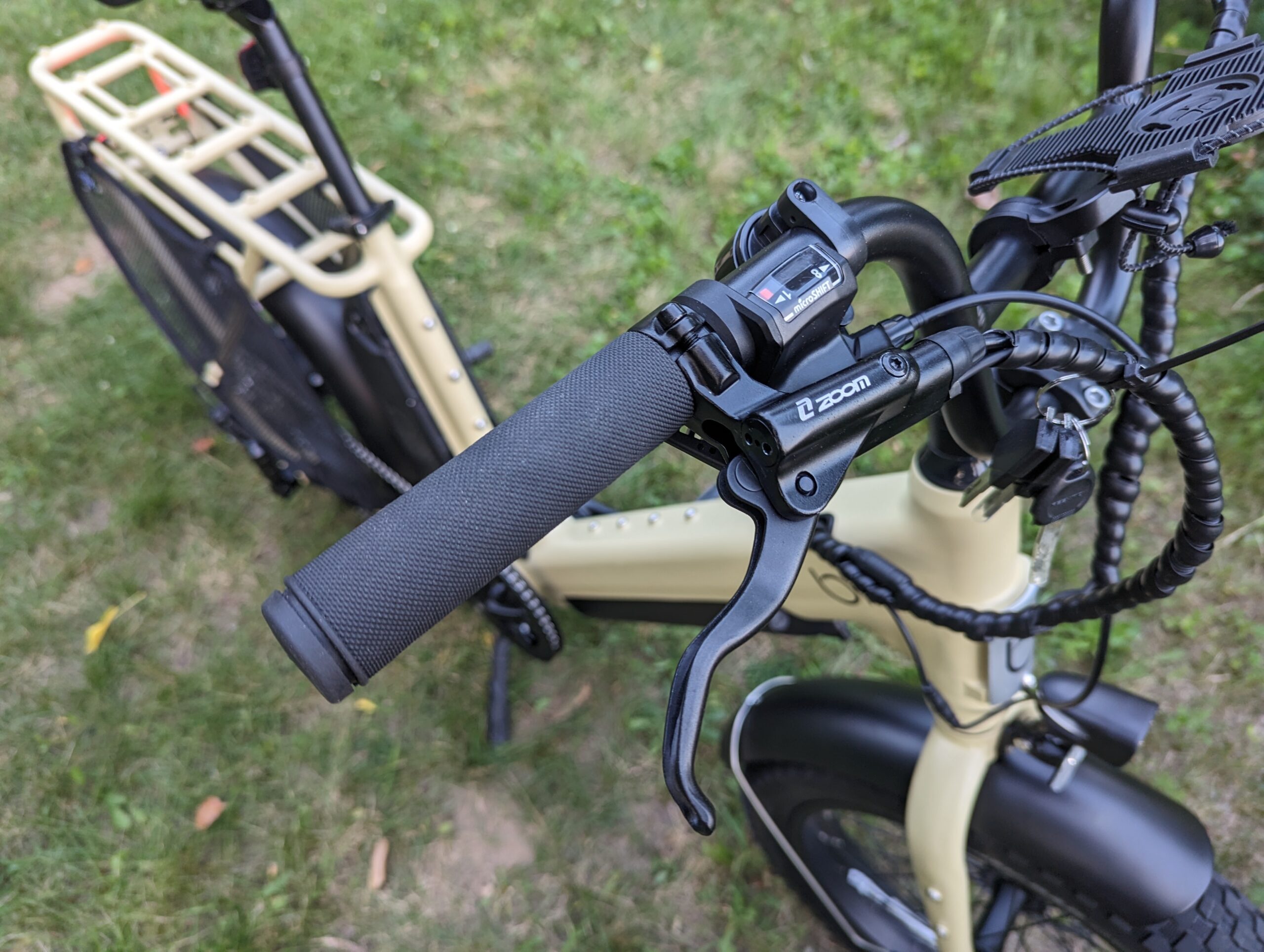 It’s good to find a few branded components on the Blix Dubbel. The Zoom hydraulic disk brakes and matching levers with cut-off offer a sure stop. And the 8-speed Microshift trigger shifter, along with Microshift 26 derailleur is a notch better than most.