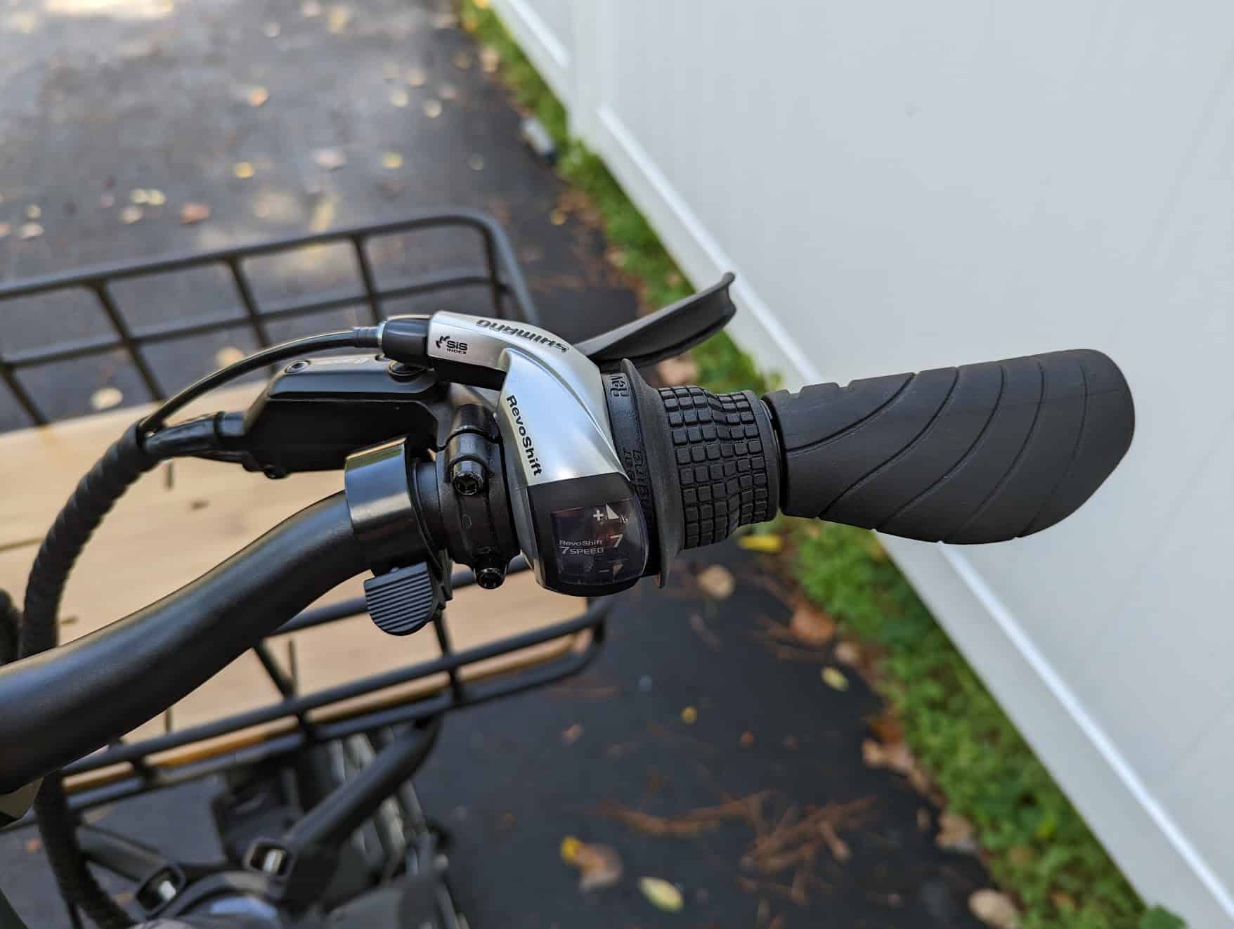 Blix chose to use a 7speed Shimano RevoShift twist-grip shifter, different from the thumb shifters we see on many ebikes. It’s paired with a Shimano Acera derailleur which is a slight step up from the more basic Shimano derailleurs (Tourney and Altus). There is a “megarange” 14-34T rear freewheel and 48T front chainring. The gearing is plenty acceptable for the 20 mph top speed and the 34 tooth low gear is nice if you encounter any significant hills.