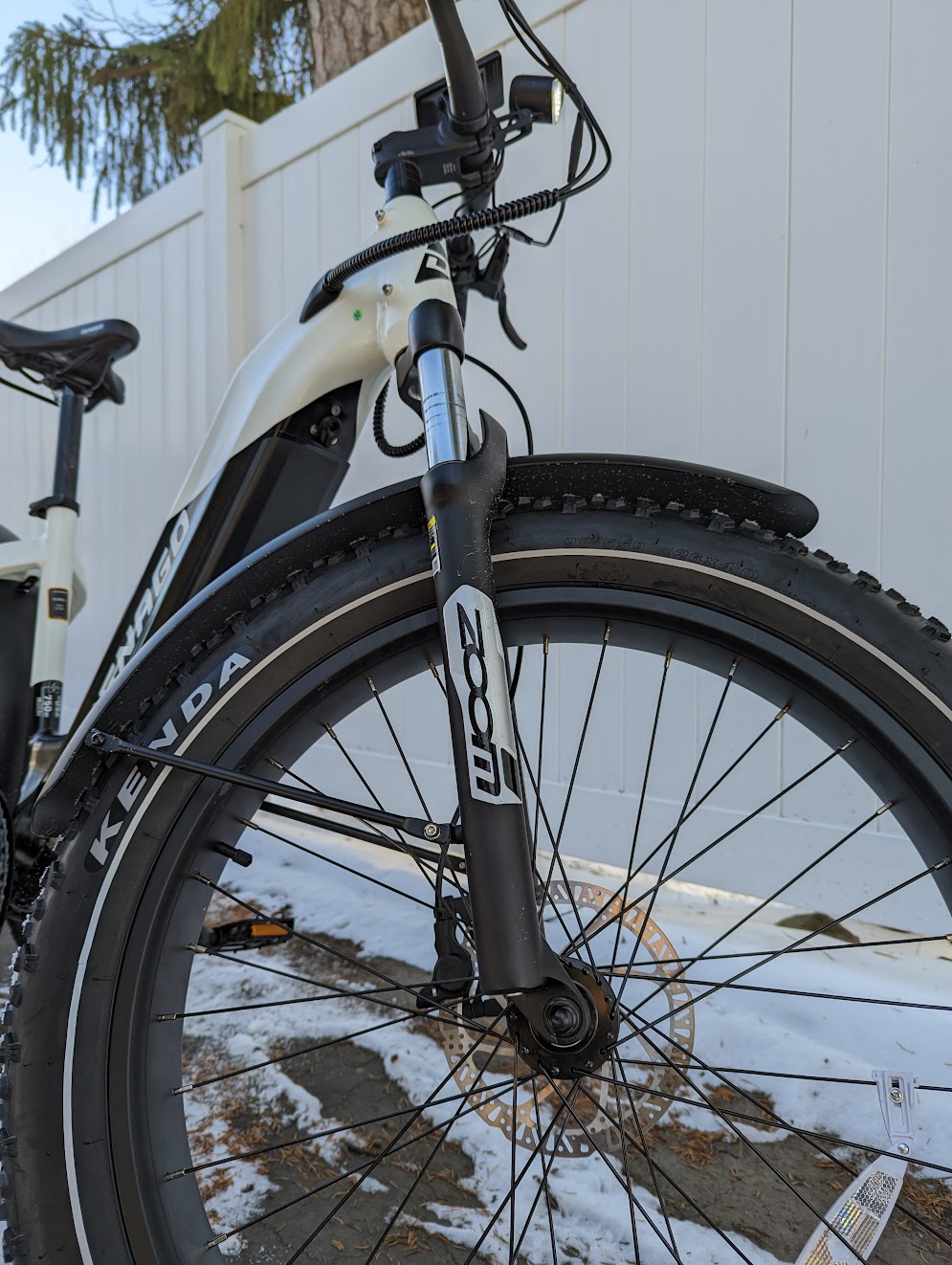 For components, let’s start with an important aspect of any fat bike, the tires. Denago features 26″ x 4″ Kenda tires which are pretty standard for this type of ebike. Simply put, they will handle any type of terrain. The brakes are Zoom hydraulic disc brakes which is always a nice upgrade compared to mechanical disc brakes. They are paired with 180 mm rotors. There is a Shimano thumb shifter, with a 7-speed Shimano Tourney Rear Derailleur. While sufficient for most riders, these are the most entry level components offered by Shimano. The crankset is 48T up front and there is a 14-28T freewheel.