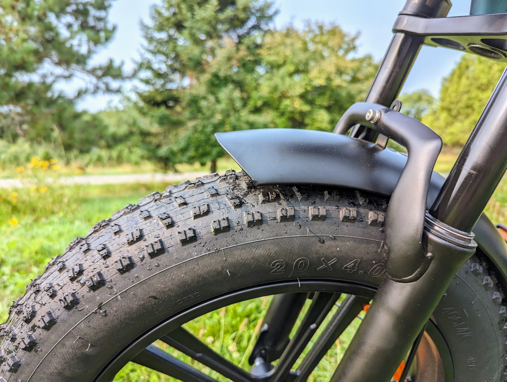 The mag wheels really add to the motorcycle or moped feel. Plus they will never need truing like spoked wheels. They are matched with 20″ x 4″ Chaoyang fat tires. The tires have some knobby tread that allows some modest off-roading. Front and rear fenders are included.