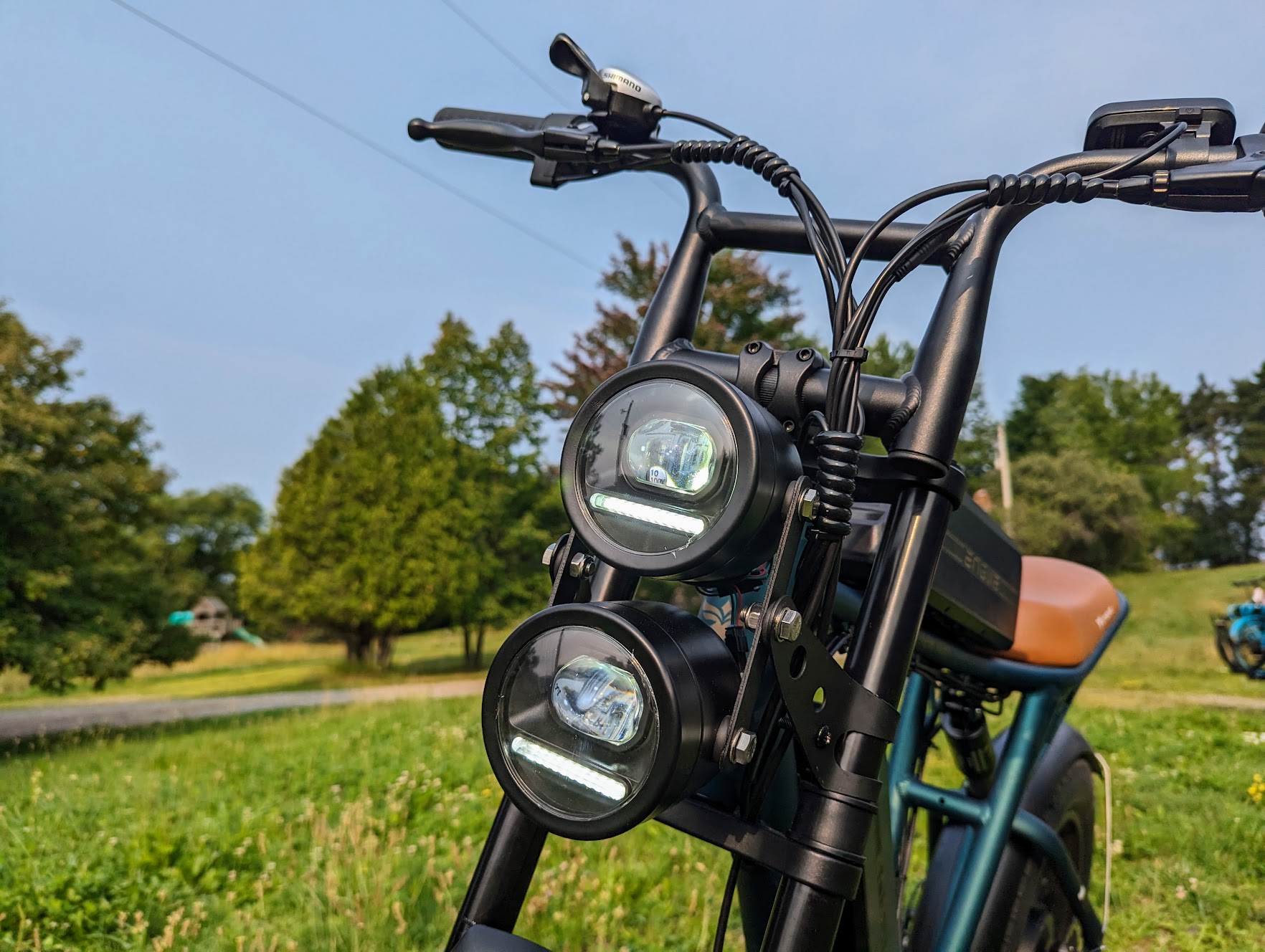 The moped-style Engwe M20 is the first Engwe ebike we had the chance to review. Due to its styling, the Engwe M20 blurs the line between ebike and motorcycle. The 20-inch Mag wheels, dual-beam headlight, double crown front fork, and placement of the second battery help add to the motorcycle styling. The gussets on the frame and slim seat add to the aesthics. This may be a great ebike if you want the look of a motorcycle but not the cost, speed, or noise.