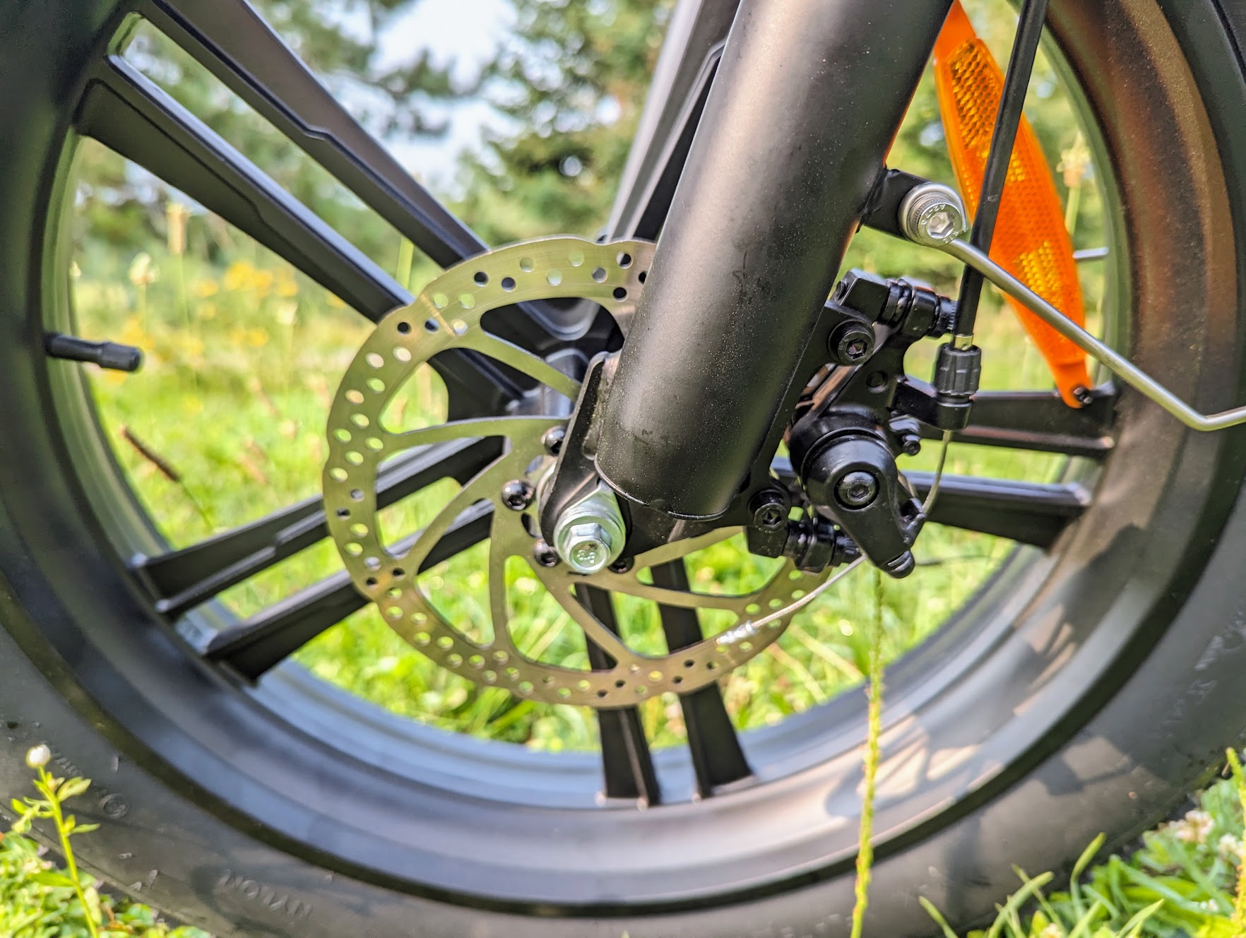 The 160mm rotors are unbranded mechanical disc brakes. They got the job done, but more pressure on the levers and more distance were required to come to a full stop. Most moped-style ebikes have hydraulic disc brakes that stop quicker and incur increased costs. Though admittedly not at this low of a price point.