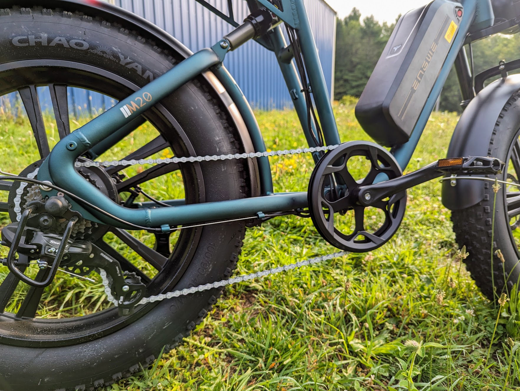For those who plan to pedal, the Engwe M20 has a Shimano Turney derailleur, which is the entry-level Shimano model. It has 7 gears with 14-28 cassette and a 48T front chainring. There tends to be a decent amount of ghost pedaling, even in PAS 1.