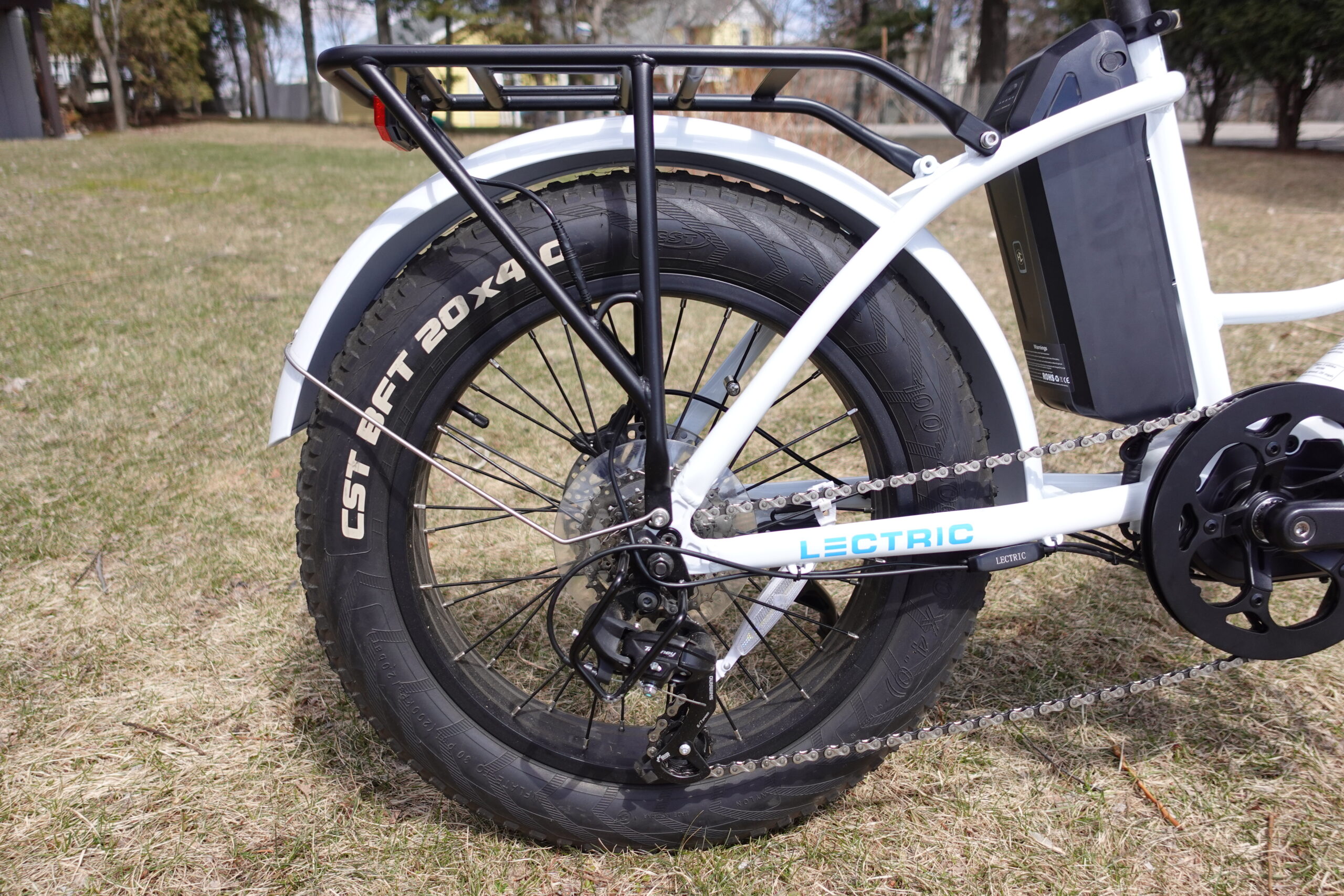Lectric went with CST BFT 20″x4″ fat tires on the XPremium, making this ebike capable of off-road riding. An 82mm front suspension fork increases comfort (the Lectric XP 2.0 front suspension only has 40mm of travel). View the full Lectric XPremium specifications.