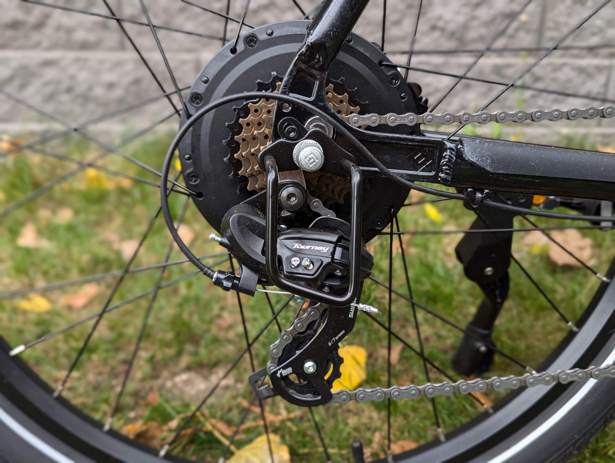 - Basic Drivetrain Components: Shimano Tourney derailleur and thumb shifter are entry-level.