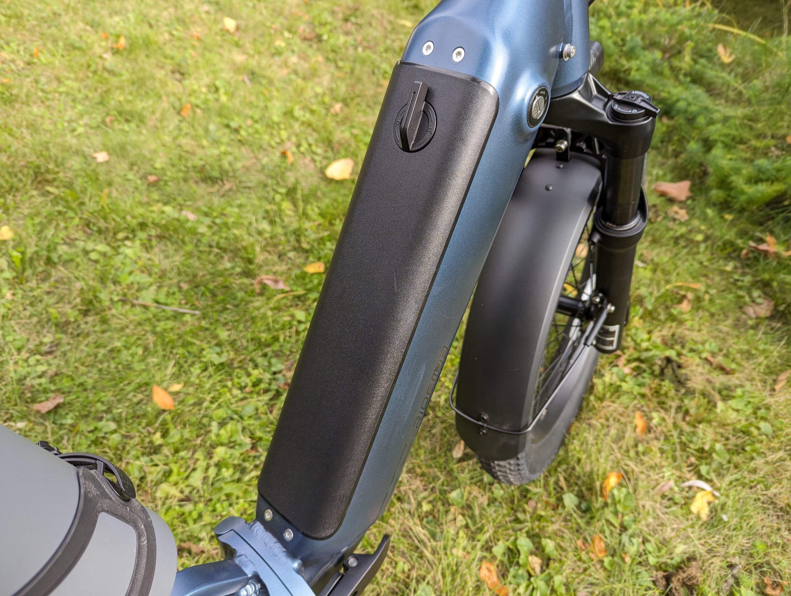The 48V Reenton Rhino batteries offer 500Wh at the 10.4AH size and 643Wh for the 13.4AH. Ride1Up suggests a range estimate of 25 to 40 miles. They can both be charged on or off the bike, using the supplied 2A charger.
