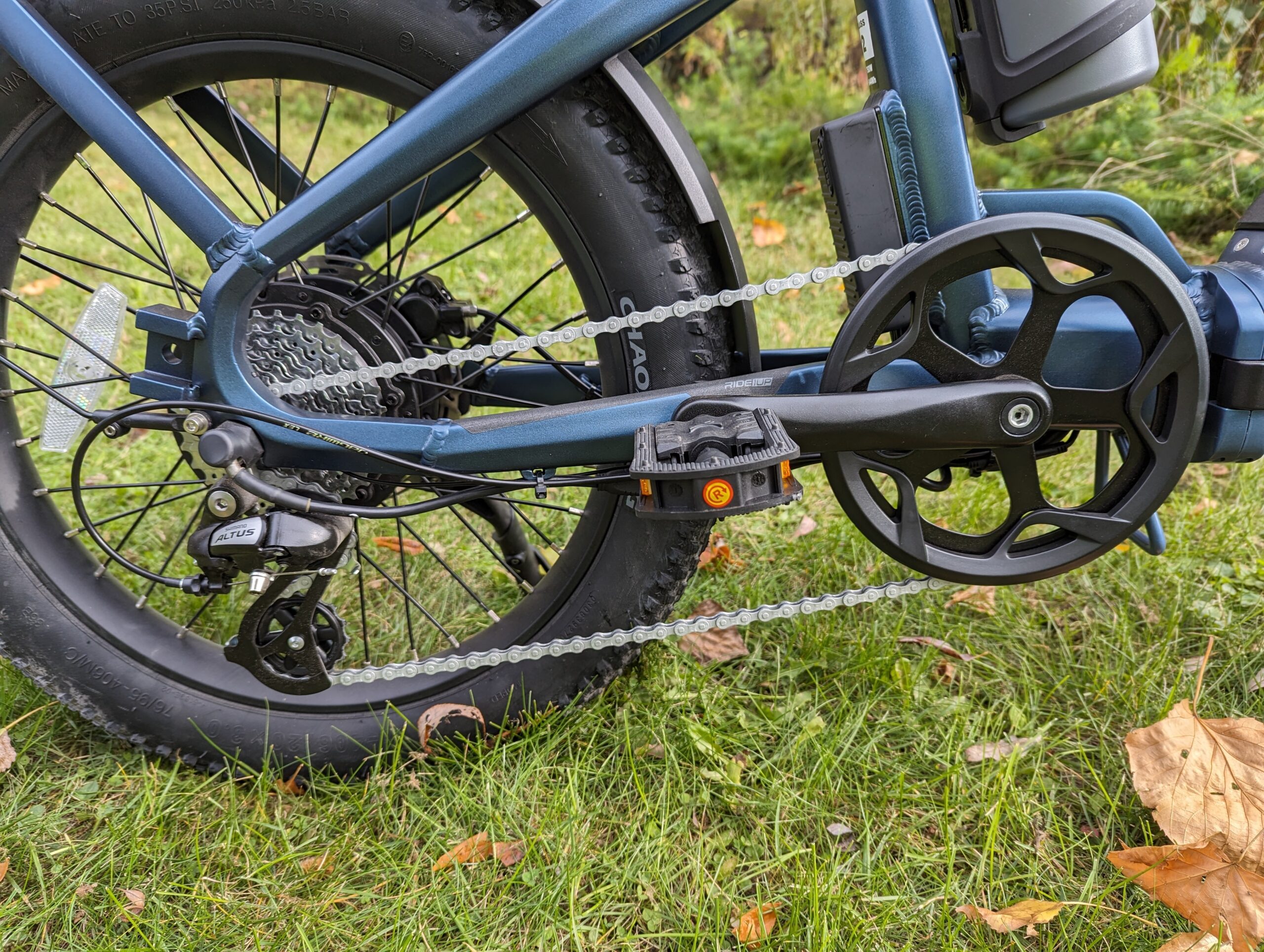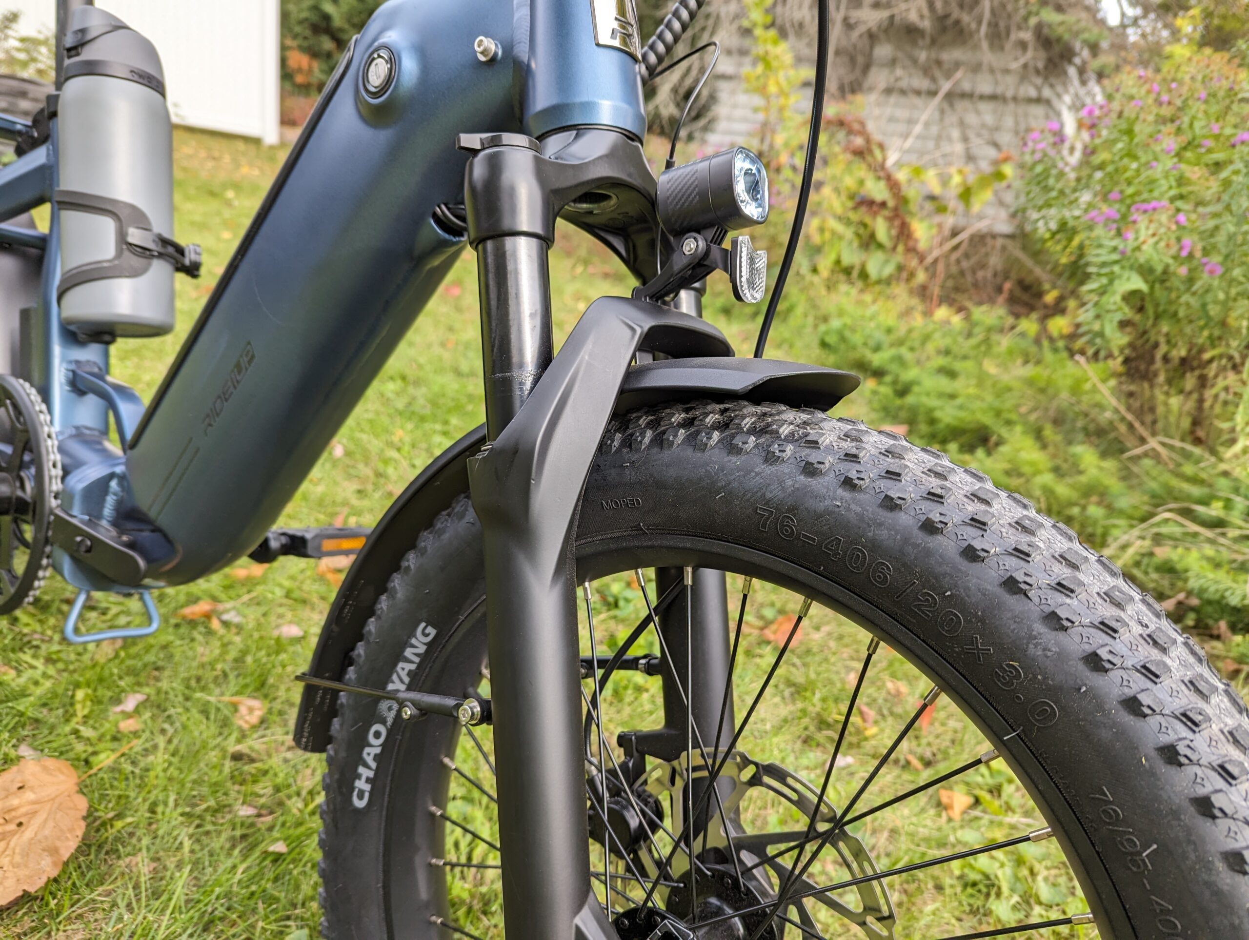 Although the suspension front fork is also pretty basic, it does provide 100mm of travel and enables some off-roading. Treaded 20” by 3” Chao Yang tires also allow for a variety of terrains. The front wheel is quick-release. And metal fenders front and back give ample coverage.