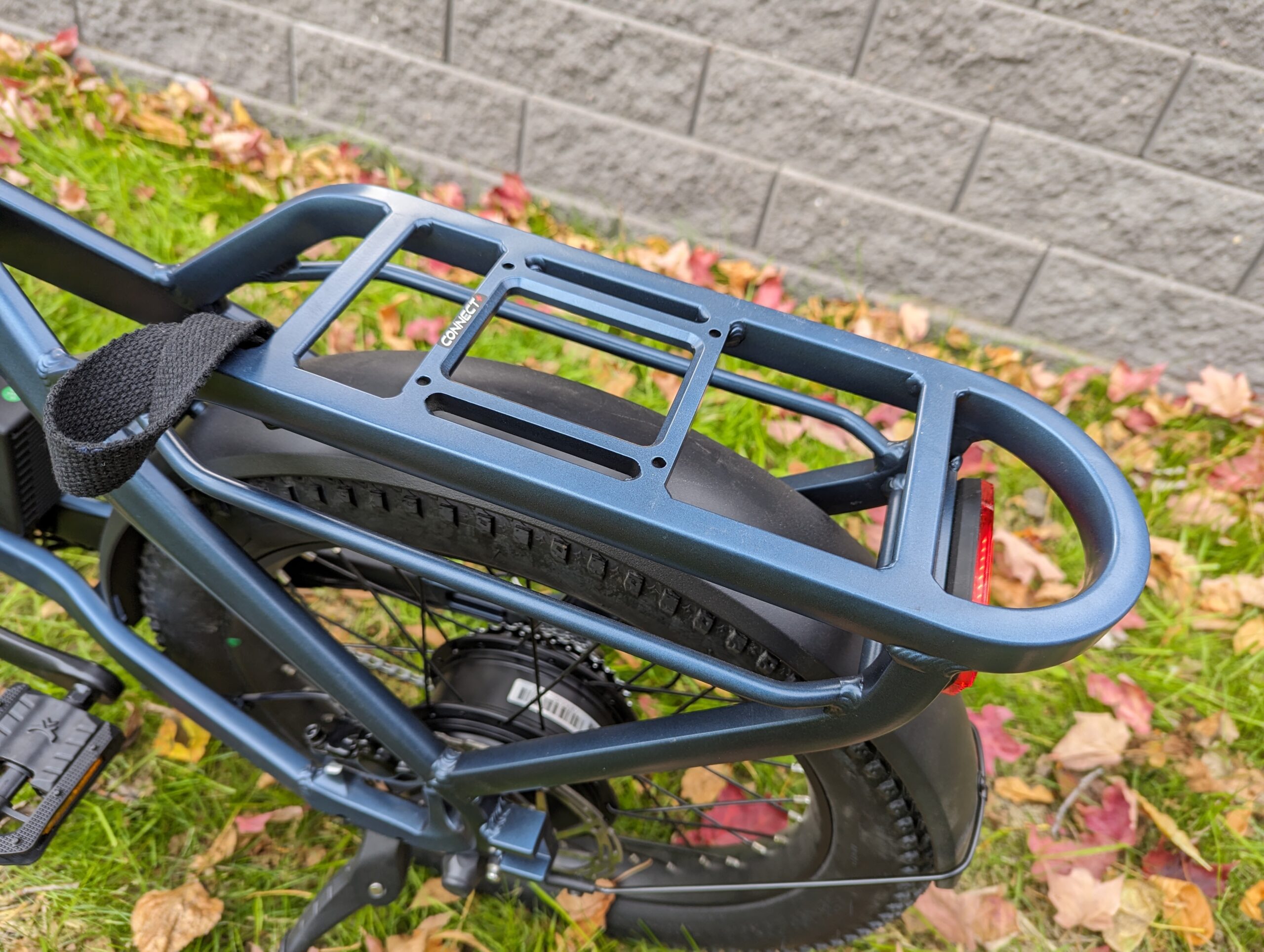 Handlebar height is not adjustable, but there is added comfort from the supplied ergonomic grips. A rear rack is welded in, to support a hefty 120lb load. Ride1Up offers accessories compatible with their Connect+ system but the rear rack is also compatible with the Thule Yepp Maxi childseat.
