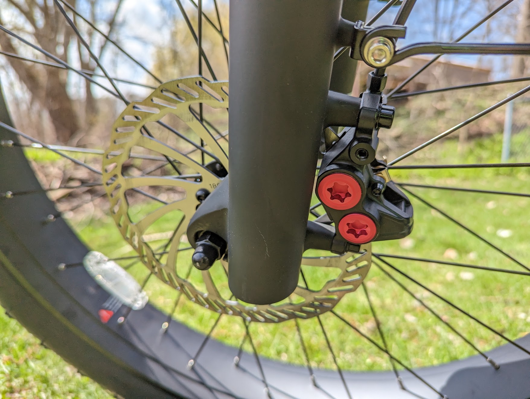 One of the higher quality features of this bike is the 4-piston hydraulic disc brakes with 180 mm rotors. Almost every other comparable fat tire ebike will only have 2-piston brakes. And that stopping power is important when you’re leveraging the full power of the motor. The Rift also features motor cut-offs, a helpful safety feature that cuts power to the motor when brakes are applied.