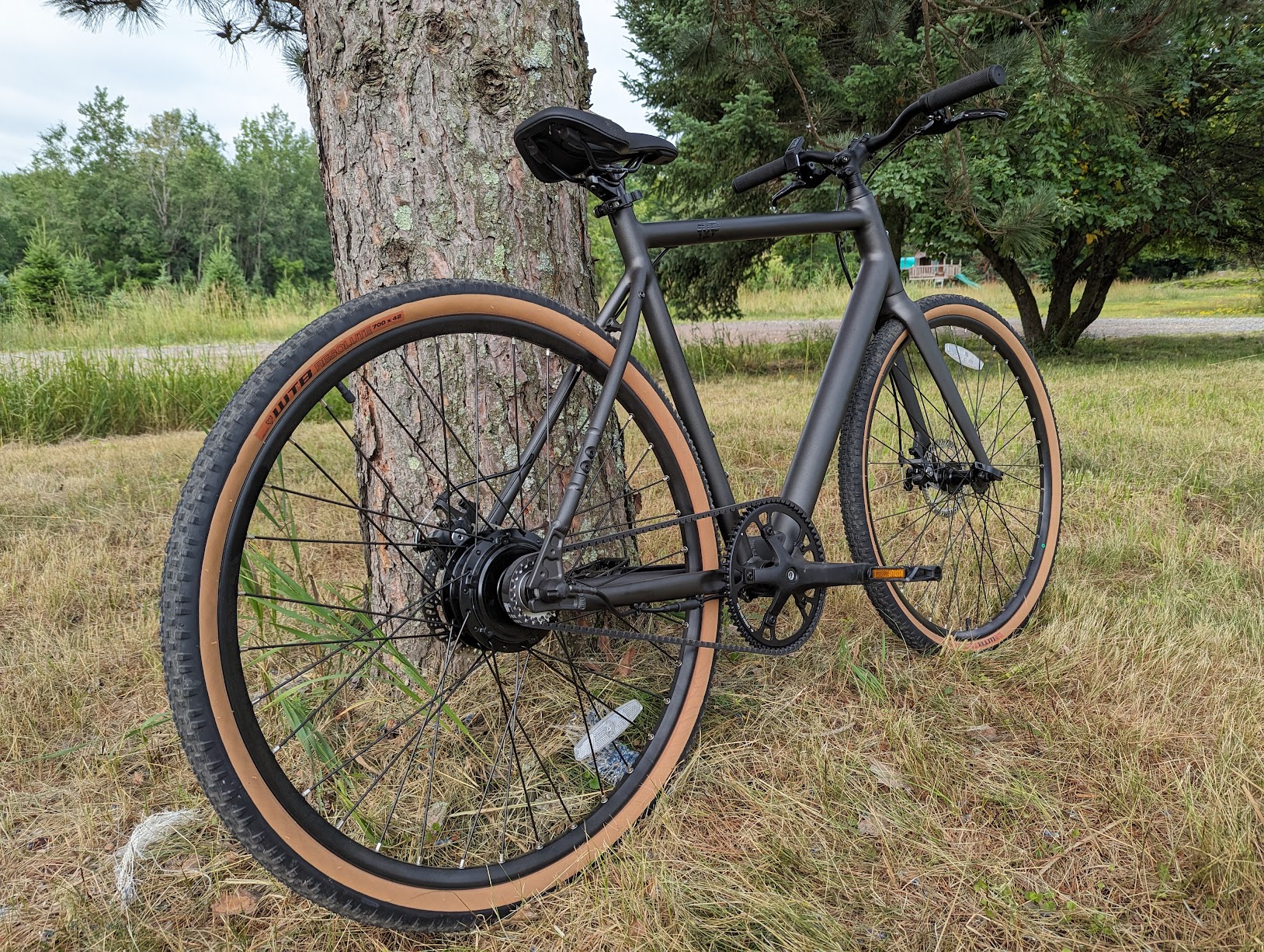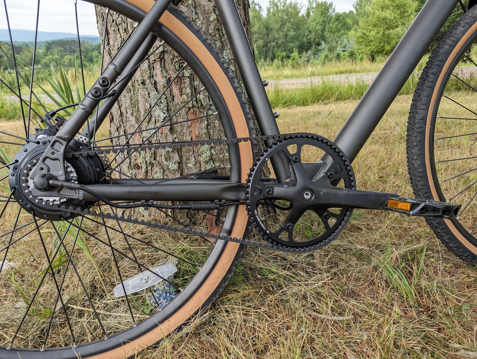 The Roadster V2 Gravel Edition is a single-speed ebike with a 63T front, 22T rear Gates carbon belt drive. That means this bike doesn’t have a traditional chain, thus requiring less maintenance. Despite well-chosen gearing, with a single-speed ebike, a small motor, and a small battery, the Roadster needs a good bit of help to get up steeper hills. Comparatively, it had no problem with speed on flats. The Roadster easily carried our 225 lb test rider over 20 mph.