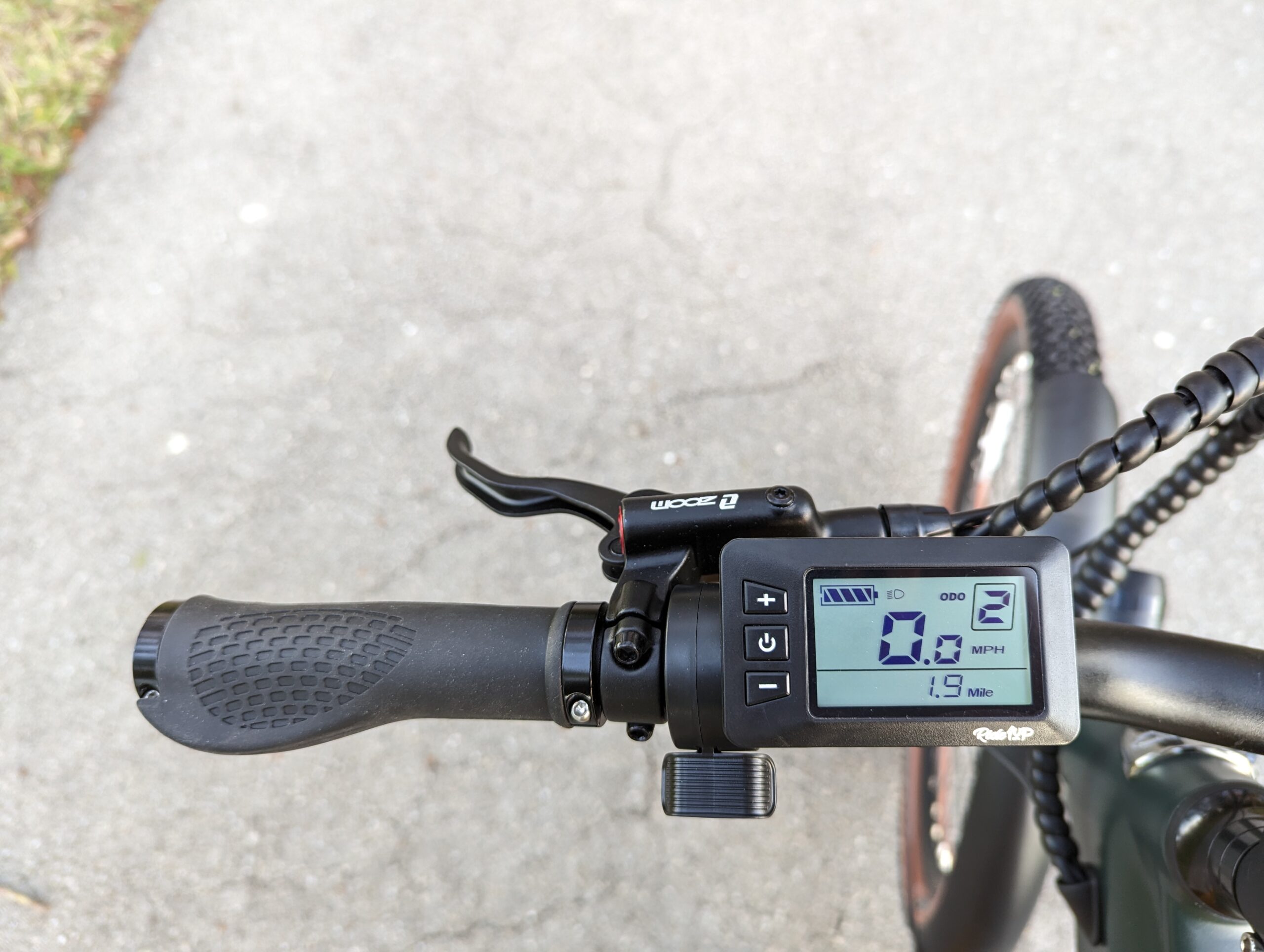 A small monochrome display is on the left side of the handlebars, next to the left-hand thumb throttle. It’s the KD21C display which gives you battery capacity, odometer, trip distance, max speed, average speed and displays your pedal assist level (1-5).